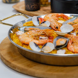 Valencian polished steel paella pan suitable for use in culinary events, catering sector or festivals.