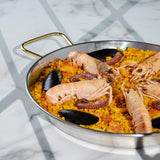 Valencian polished steel paella pan suitable for use in culinary events, catering sector or festivals.